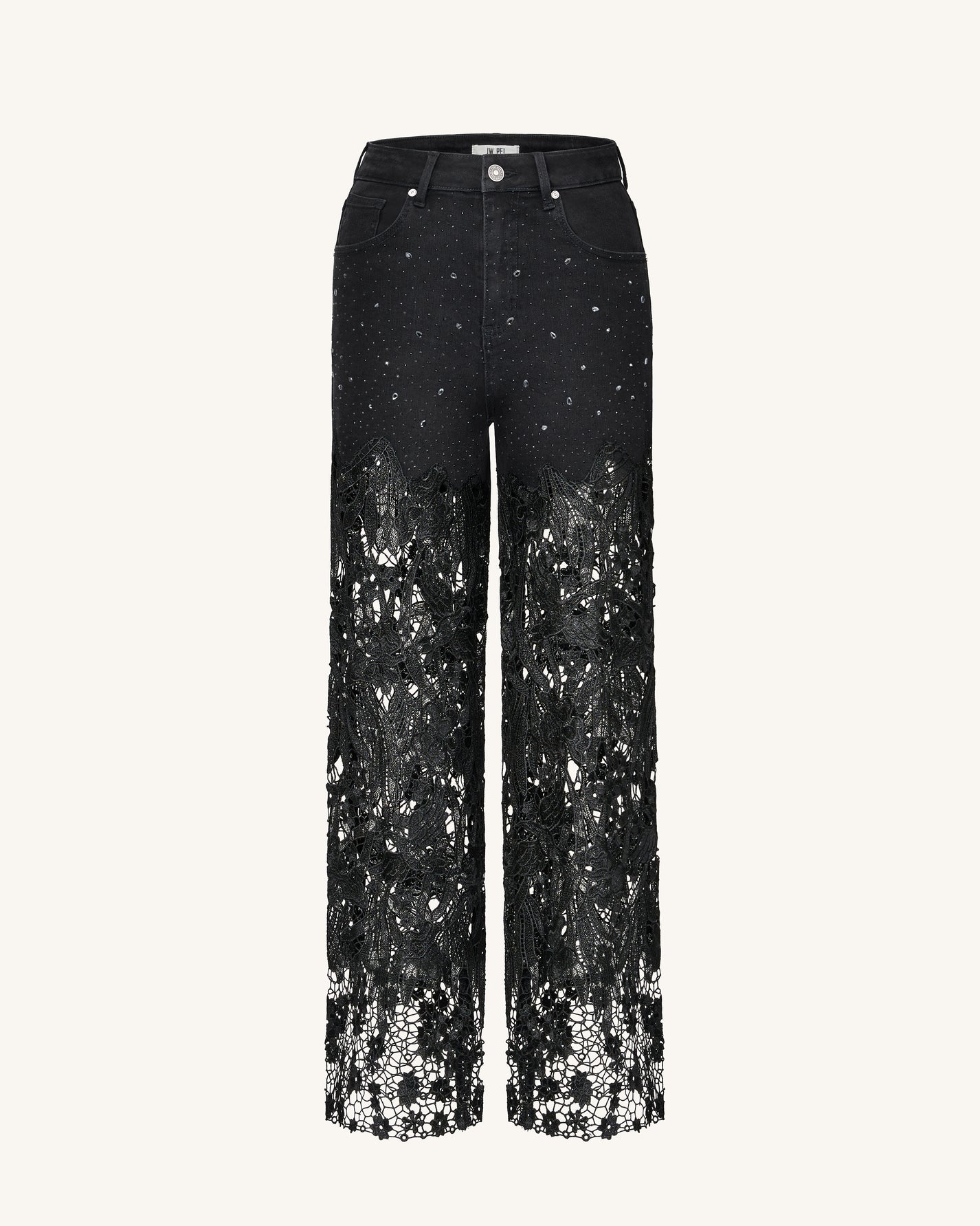레이스 자수와 큐빅이 장식된 하이웨이스트 와이드 핏 데님 진 - 블랙