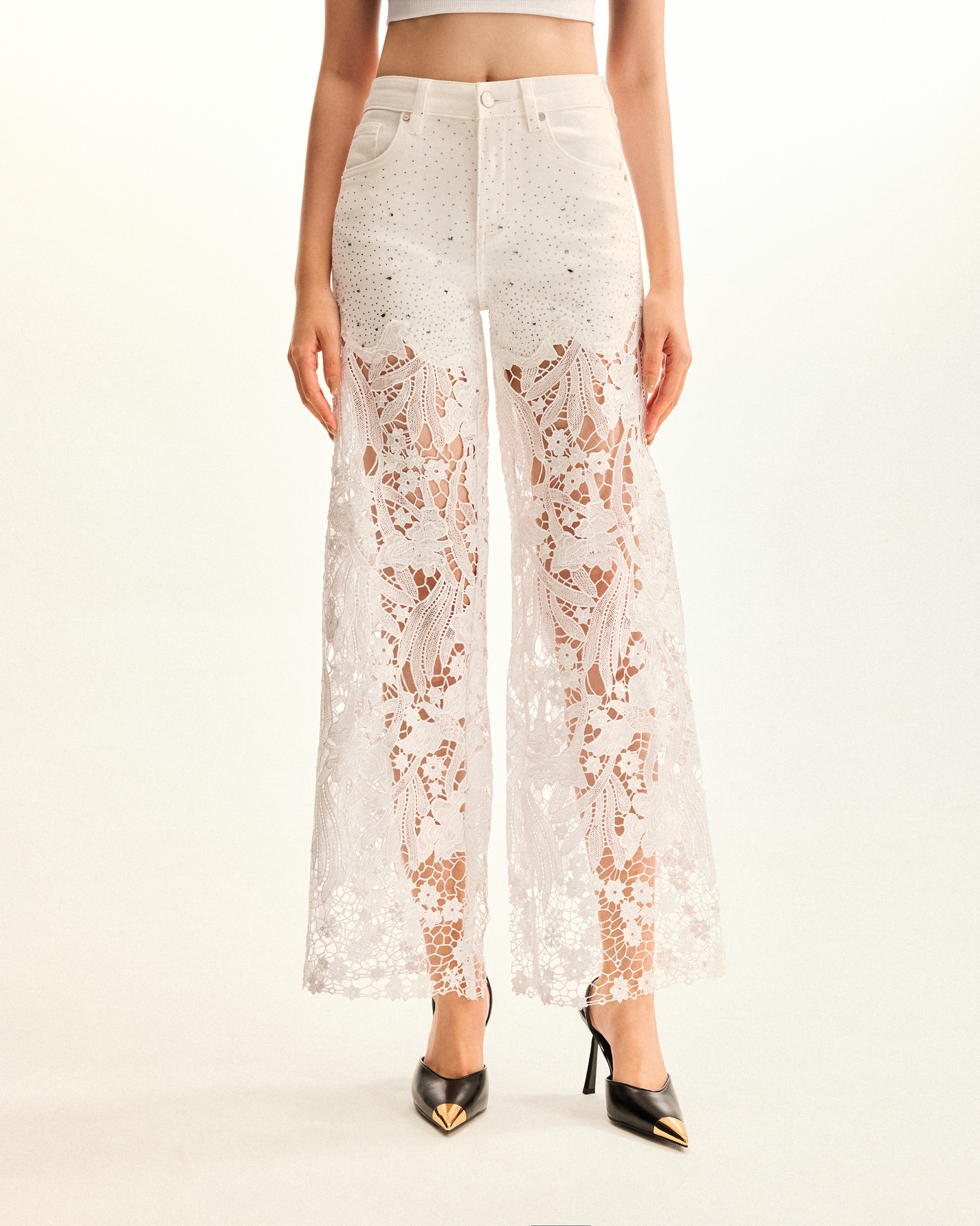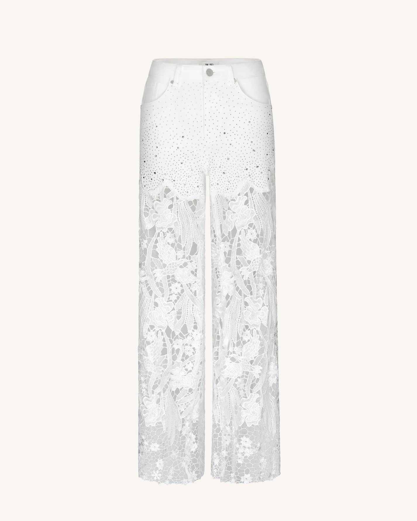자수 레이스 장식과 큐빅이 더해진 하이웨이스트 와이드 핏 화이트 데님 진