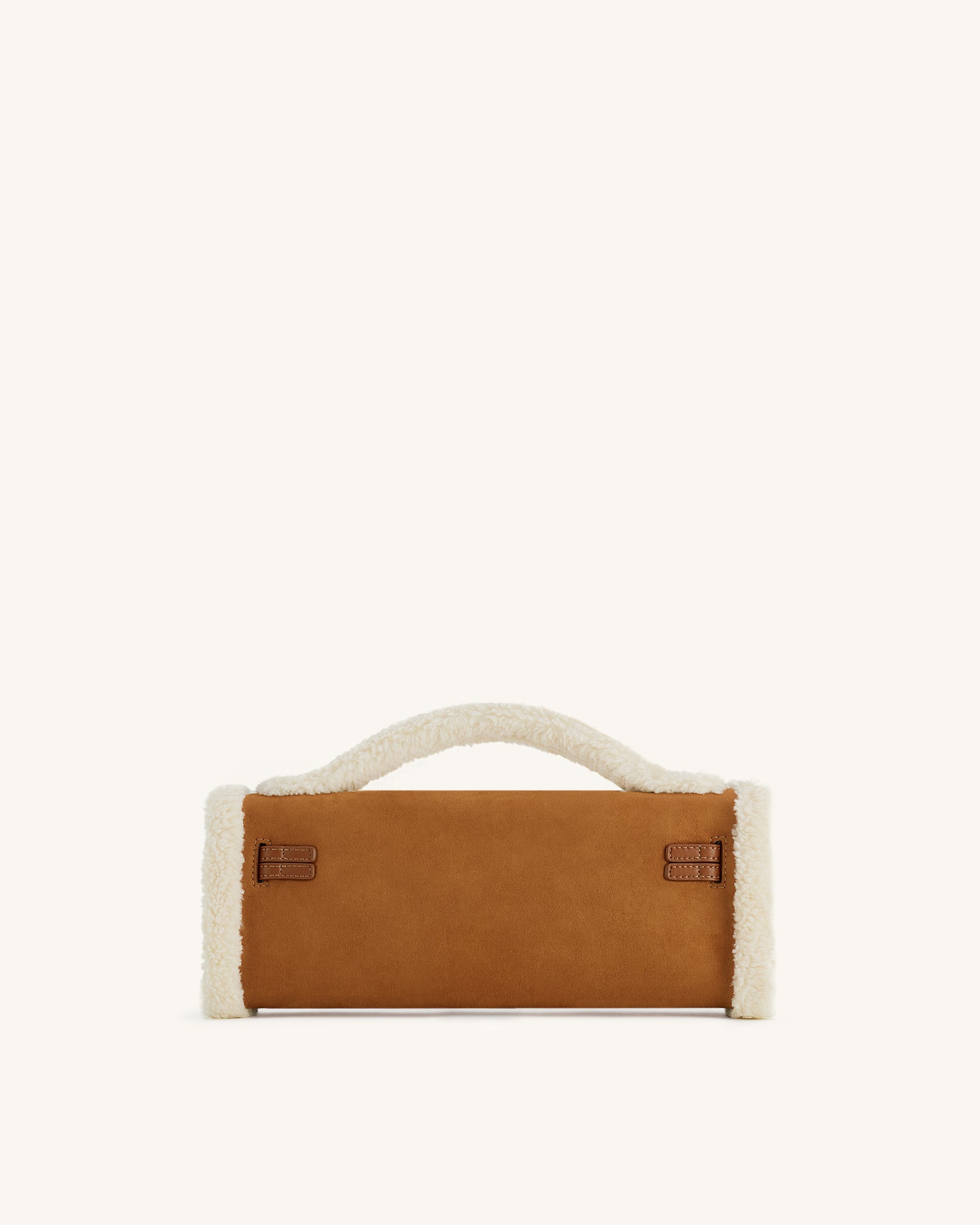 브라운 컬러의 페이크 스웨이드 소재에 셰어링 트리밍이 더해진 구조적인 직사각형 탑 핸들 백. 골드 톤 하드웨어와 안전한 트위스트 잠금장치로 마무리되었습니다. 콤팩트하면서도 포근하고 세련된 무드의 아이템입니다.