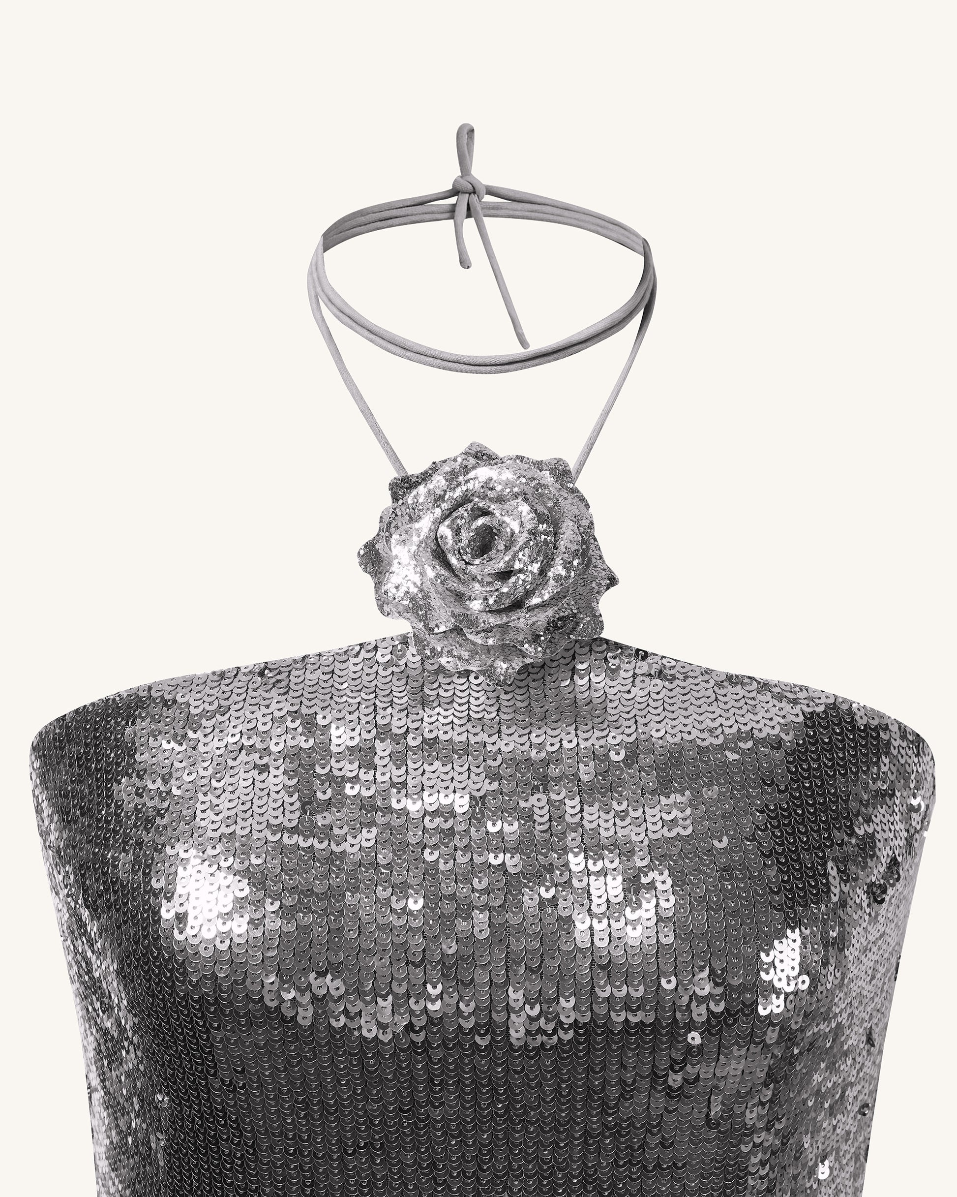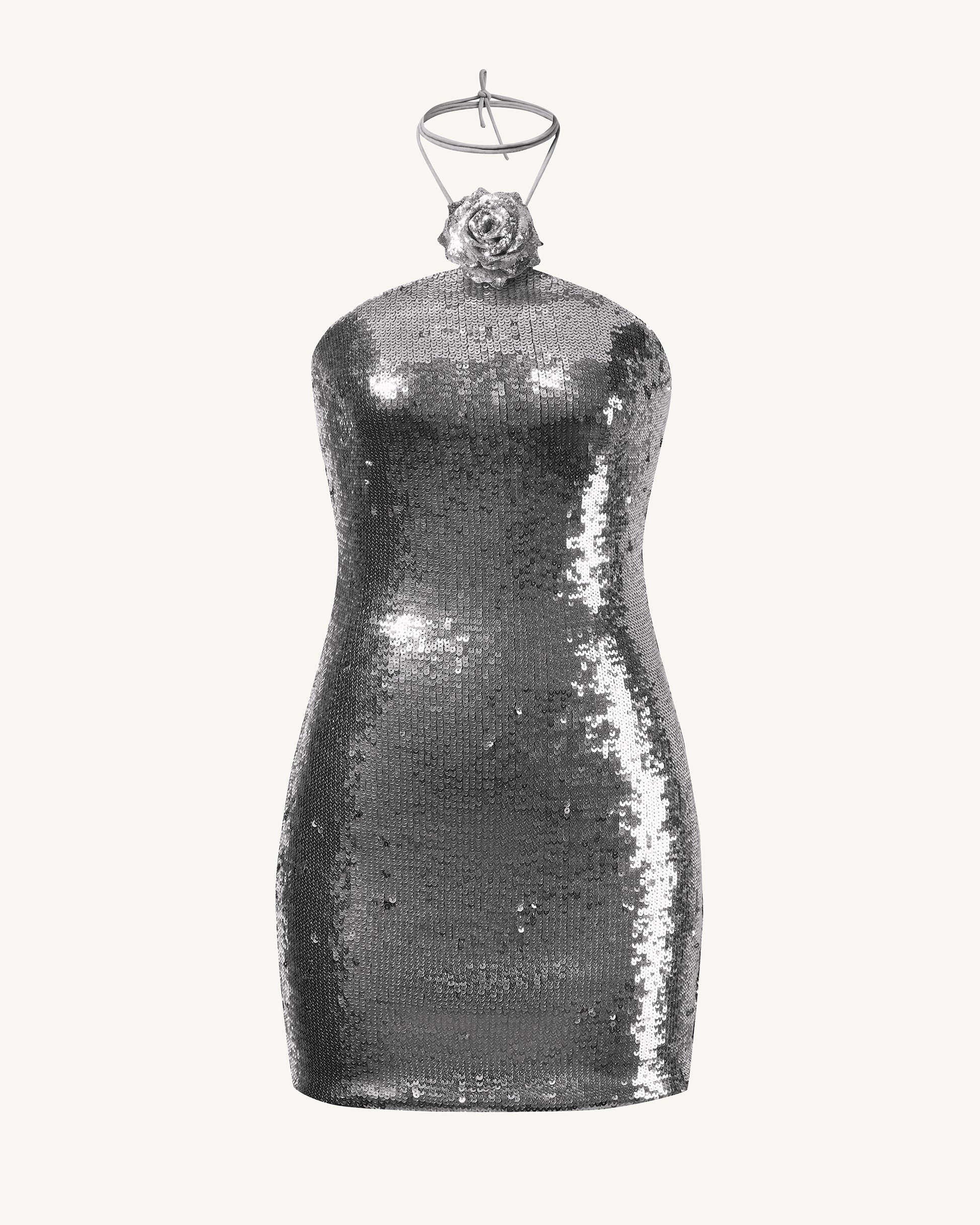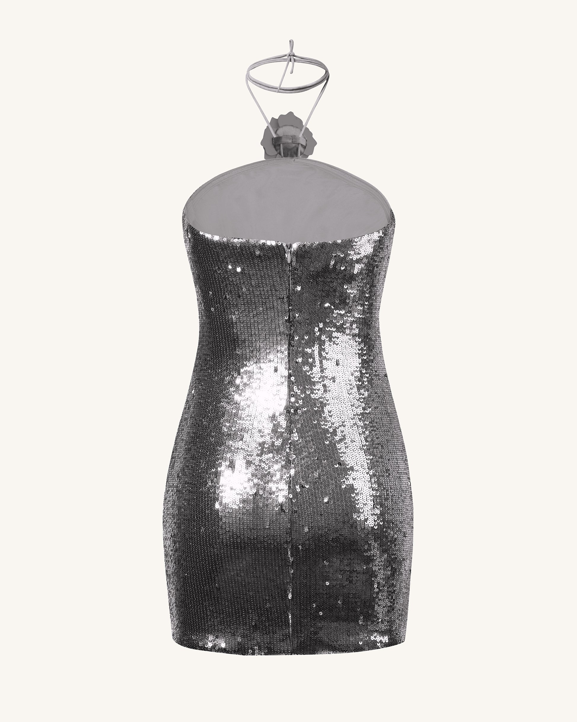 Burgundy 실버 시퀸 홀터 미니 드레스 - 실버