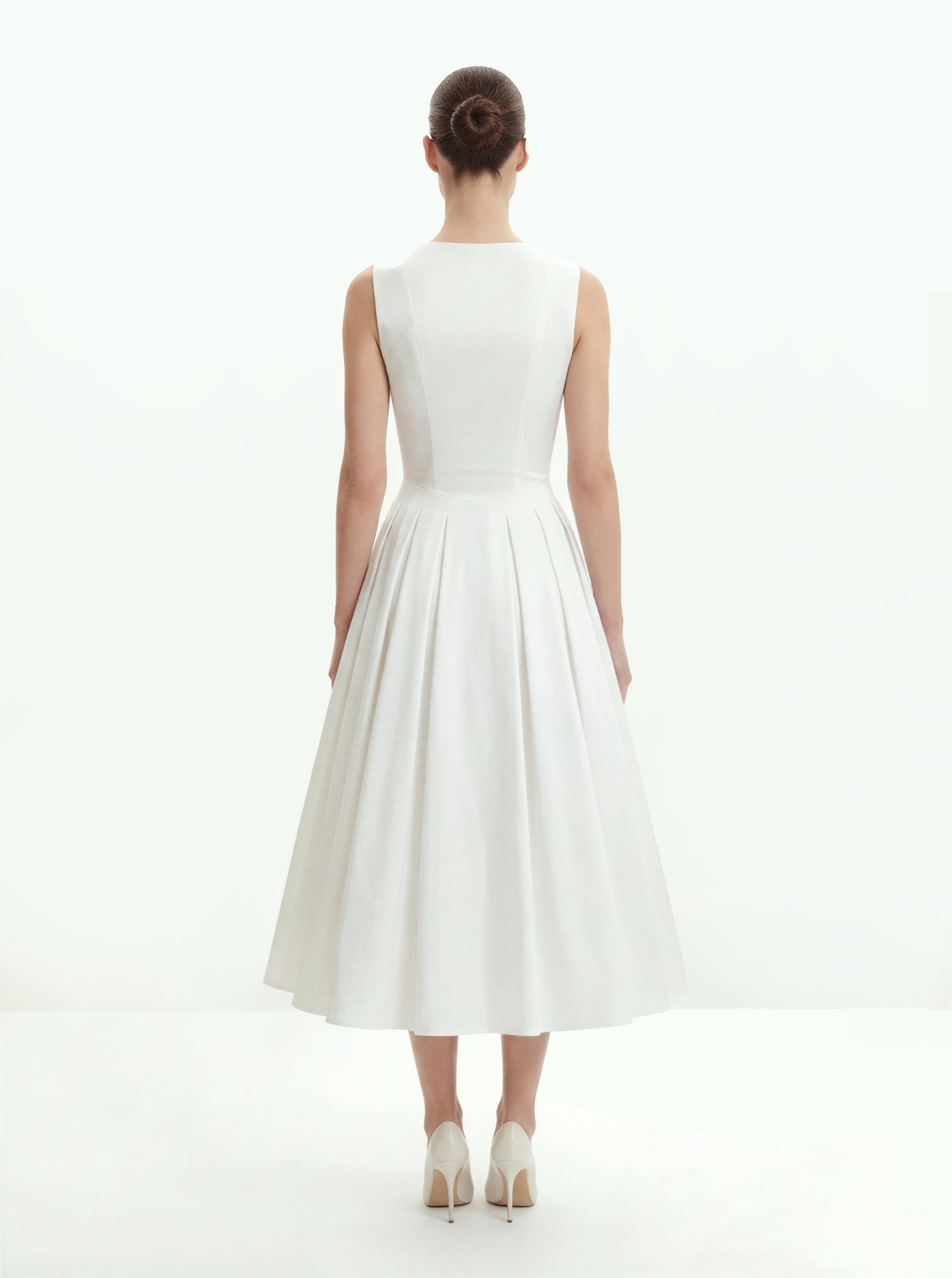 프론트 브이넥 플리츠 미디 드레스 - 화이트
