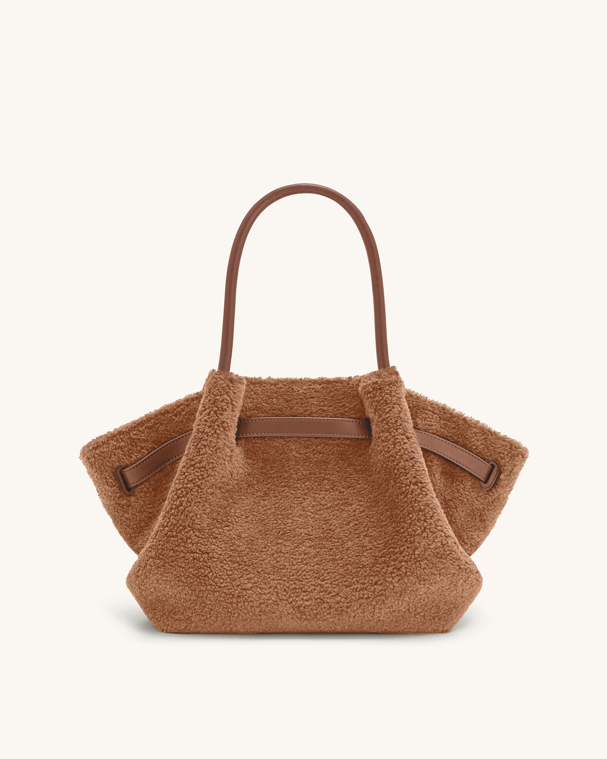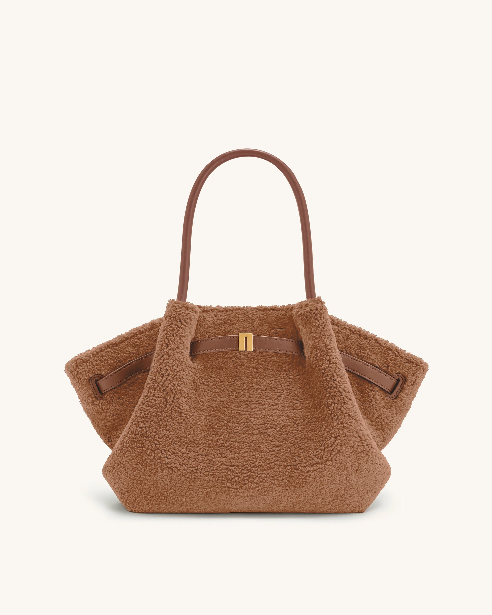 이 커피 브라운 색상의 포근한 트라페즈 토트백은 부드러운 시어링 느낌의 텍스처와 부드러우면서도 구조적인 실루엣이 특징입니다. 길게 디자인된 손잡이와 넉넉한 내부 공간으로 따뜻함과 스타일을 동시에 갖춰 추운 계절에 완벽한 액세서리입니다.