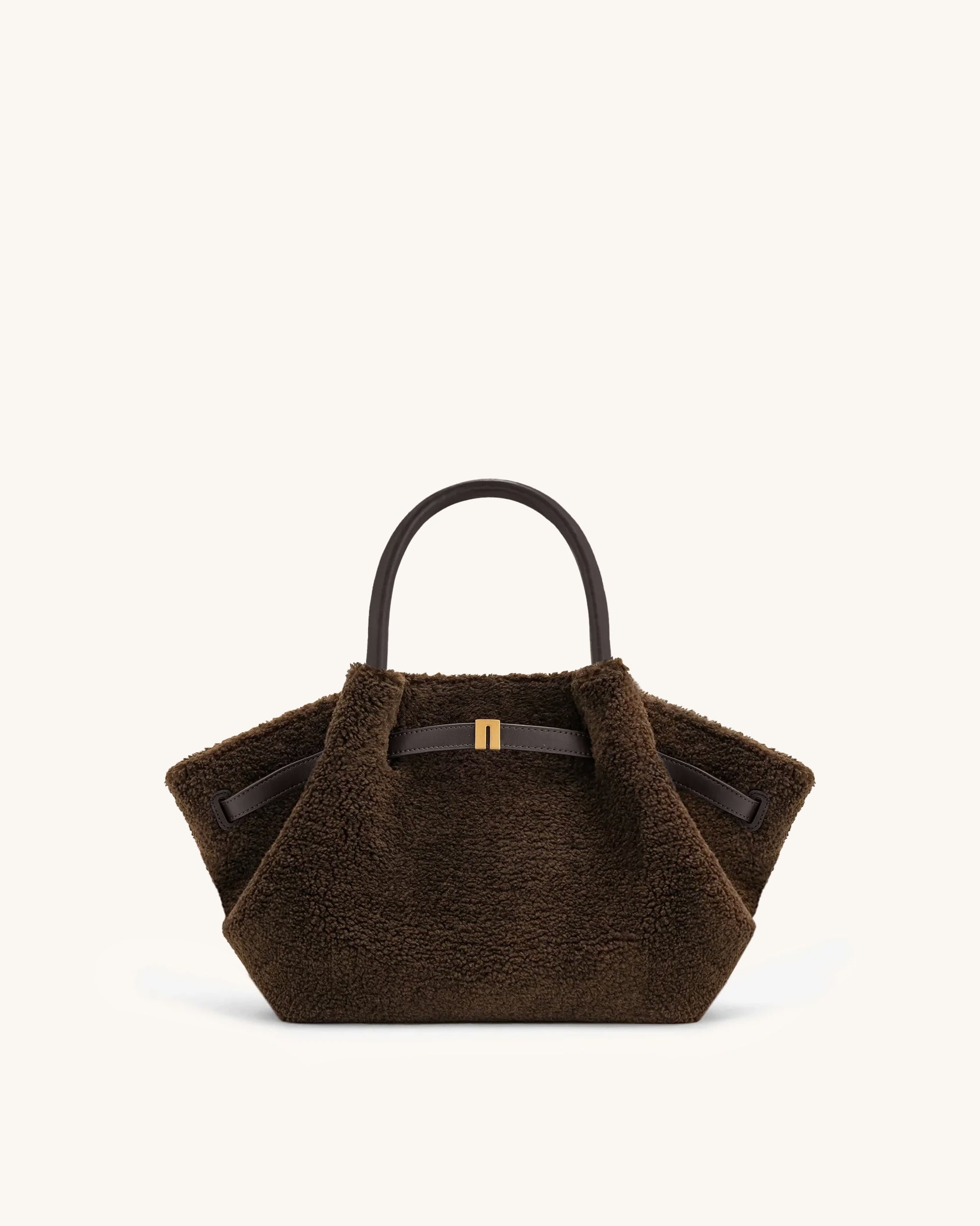 이 아늑한 토트백은 부드러운 다크 브라운 시어링 텍스처의 조각 같은 사다리꼴 실루엣을 특징으로 합니다. 매끄러운 가죽 느낌의 손잡이와 골드 톤 디테일이 더해져 일상 복장에 따뜻함과 스타일을 더해주는 완벽한 겨울 동반자입니다.