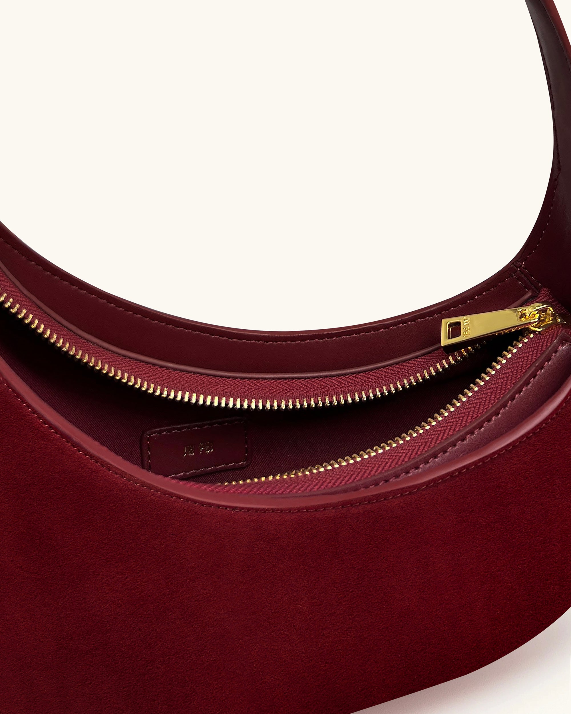 이 와인 레드 숄더백은 페이크 스웨이드 소재로 제작된 세련된 크레센트 실루엣에 길고 드라마틱한 프린지 디테일이 더해져 대담하고 트렌디한 무드를 연출합니다. 가볍지만 탄탄한 구조로 보헤미안 감성과 도시적인 세련미를 자연스럽게 조화시켜, 데이 투 나잇 스타일링에 이상적입니다.