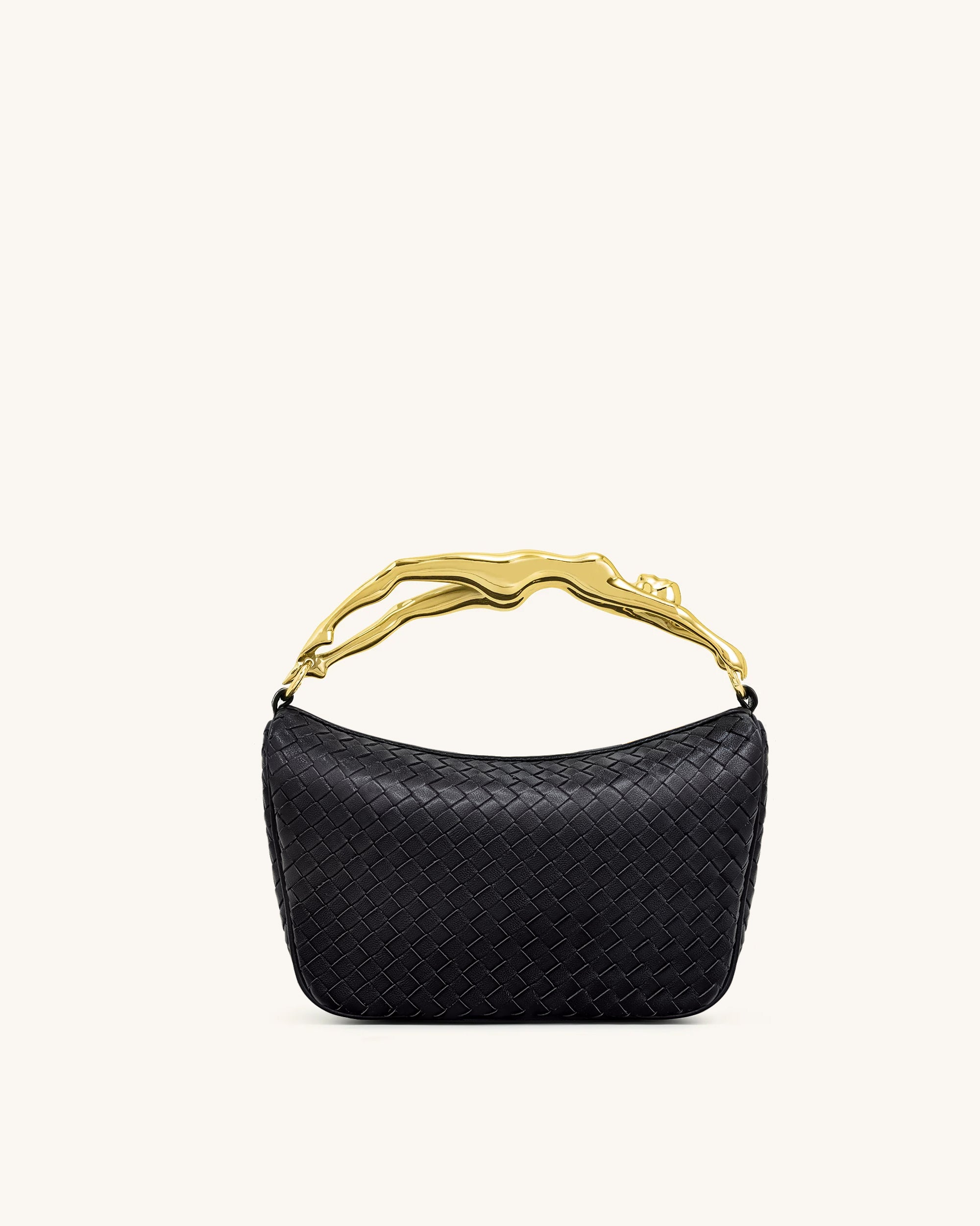 이 핸드백은 누워 있는 사람 형태의 조형적인 골드 메탈 핸들과 세련된 제트 블랙 위빙 바디가 조화를 이루는 디자인입니다. 컴팩트한 실루엣과 정교한 디테일이 어우러져 예술적인 감성과 현대적인 세련미를 동시에 담아낸, 어떤 자리에서도 돋보일 수 있는 액세서리입니다.