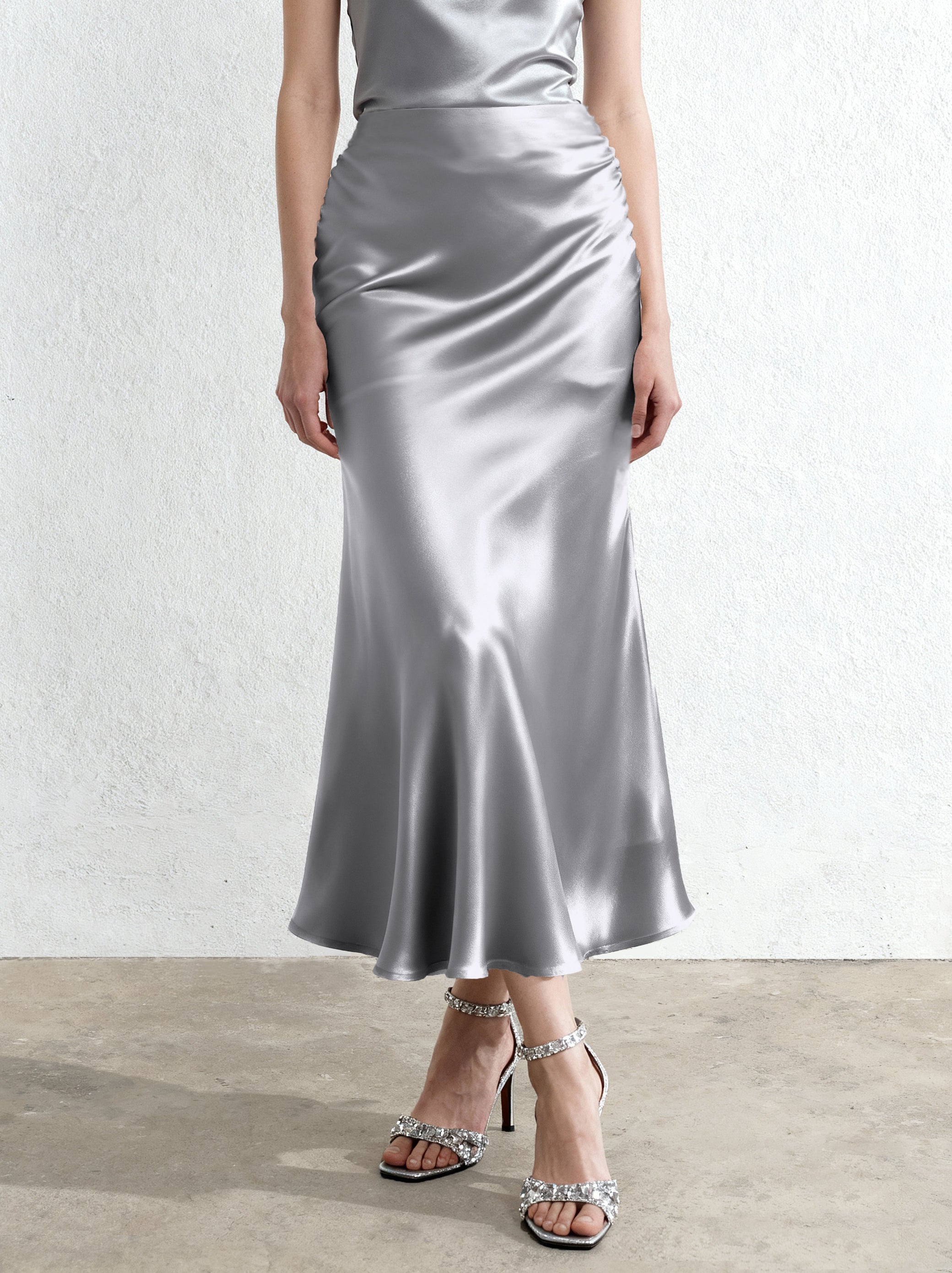 리퀴드 새틴 머메이드 맥시 스커트 - 실버