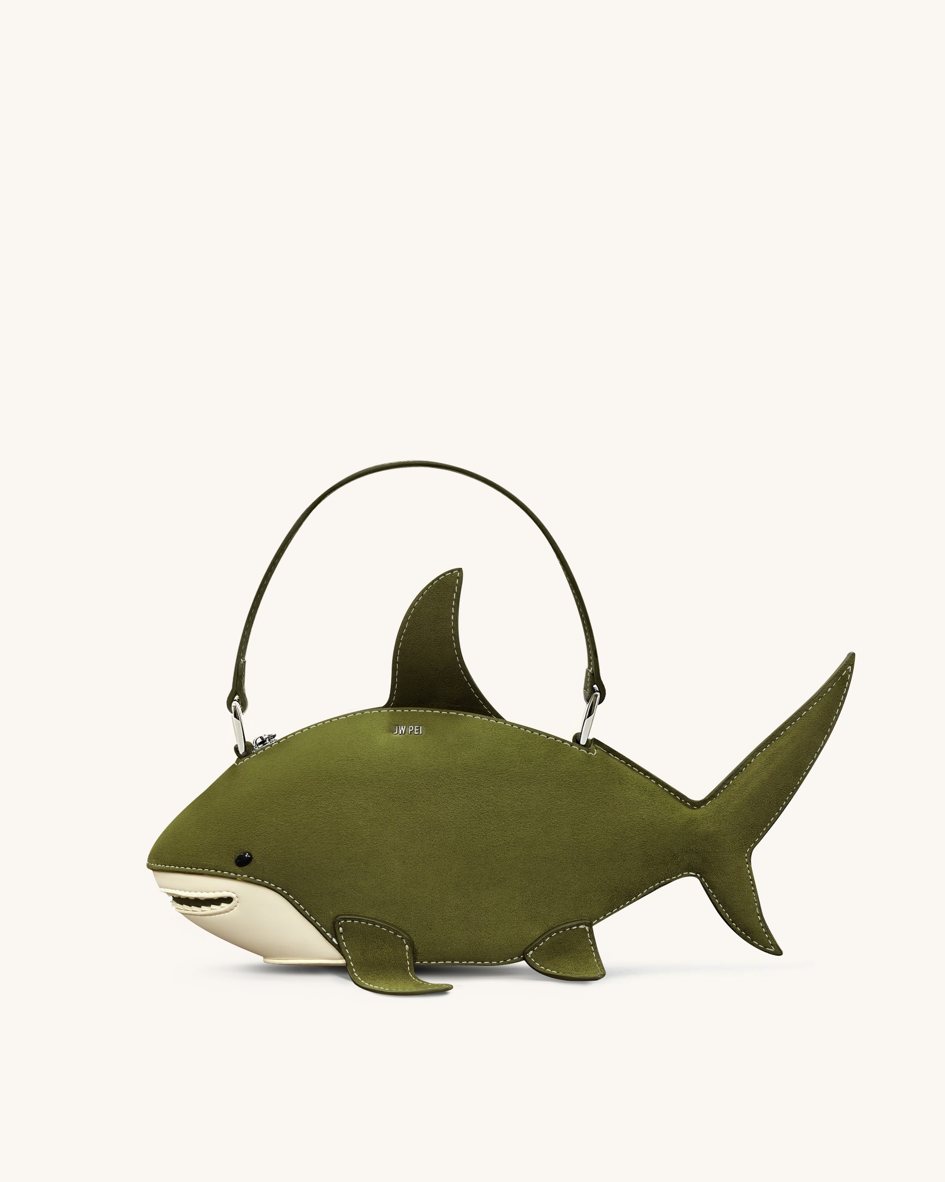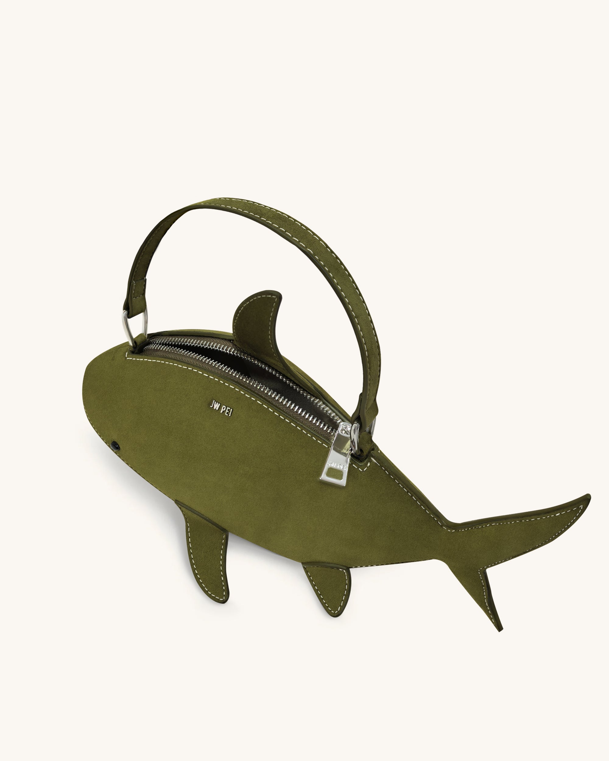 올리브 그린 스웨이드 텍스처에 디테일한 대비 스티치가 돋보이는 독특한 상어 모양 핸드백입니다. 탑 핸들과 지퍼 여밈으로 실용성을 더했으며, 스타일에 재미와 시선을 동시에 더해주는 포인트 아이템입니다.