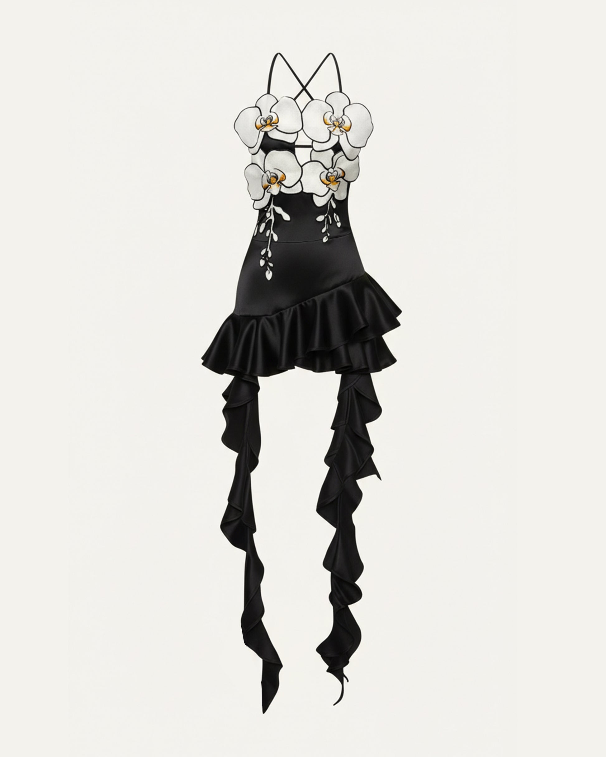 오키드 자수 러플 헴 미니 드레스 - 블랙