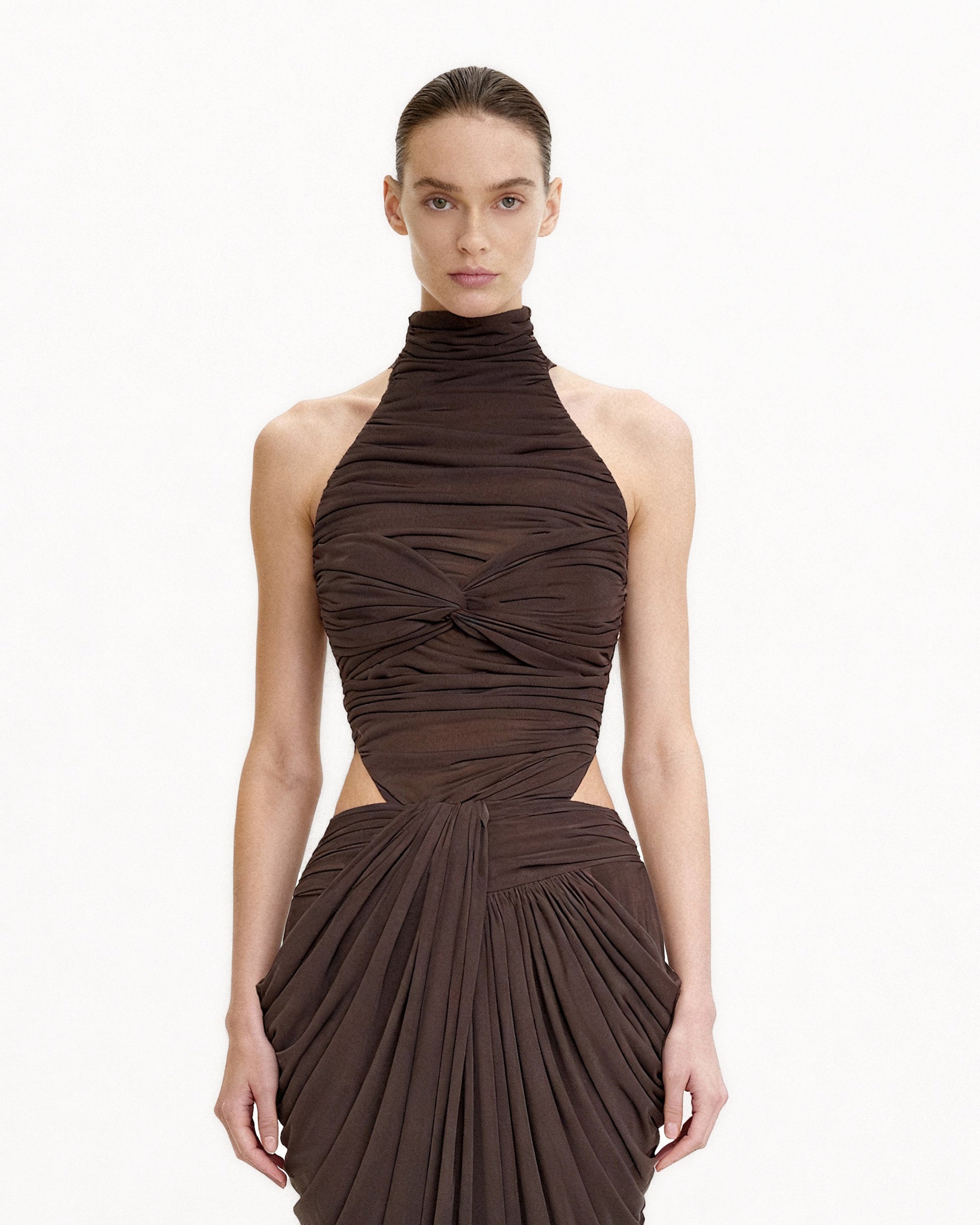 러플 트위스트 프론트 홀터 바디수트 - 브라운