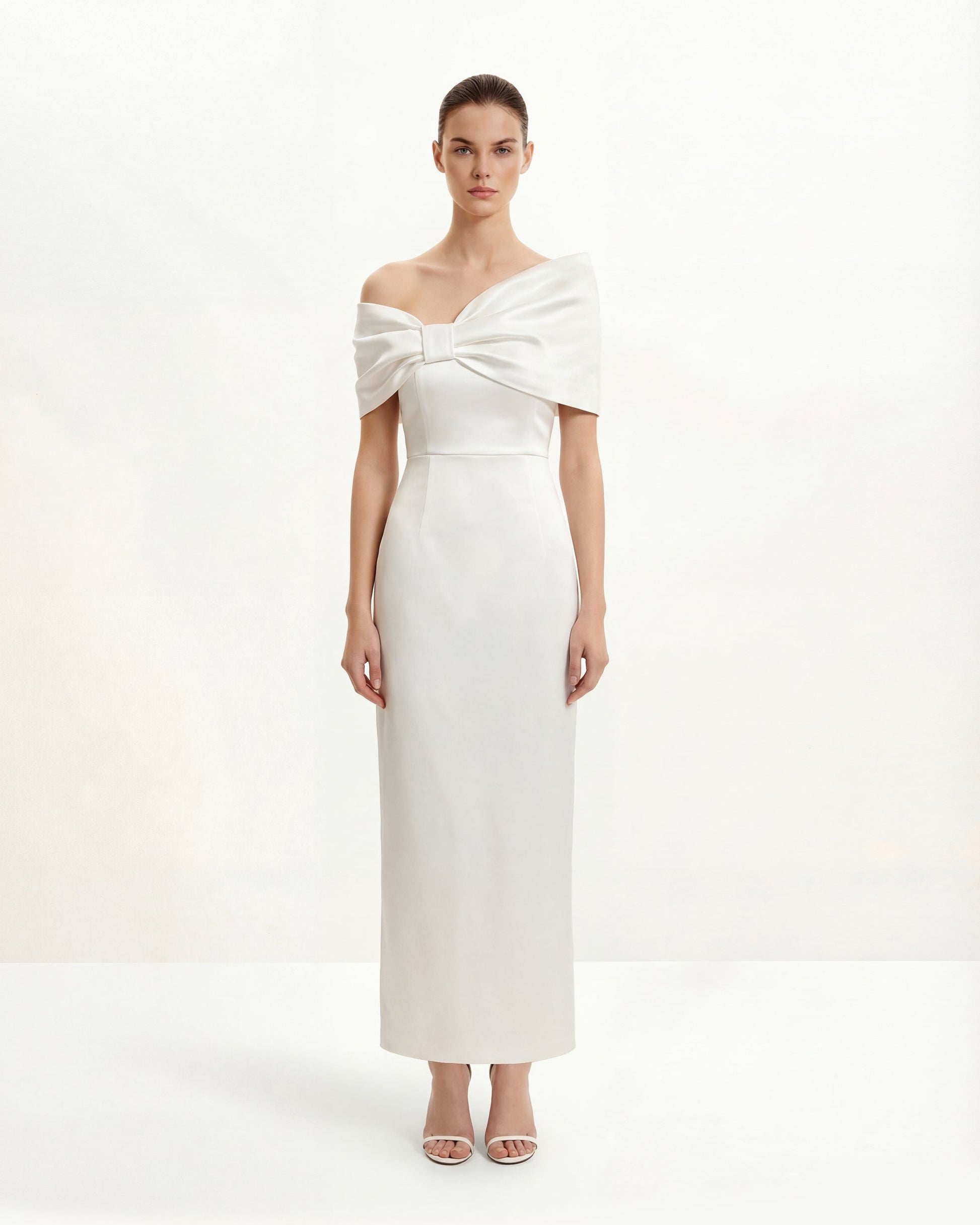 새틴 비대칭 보우 맥시 드레스 - 화이트