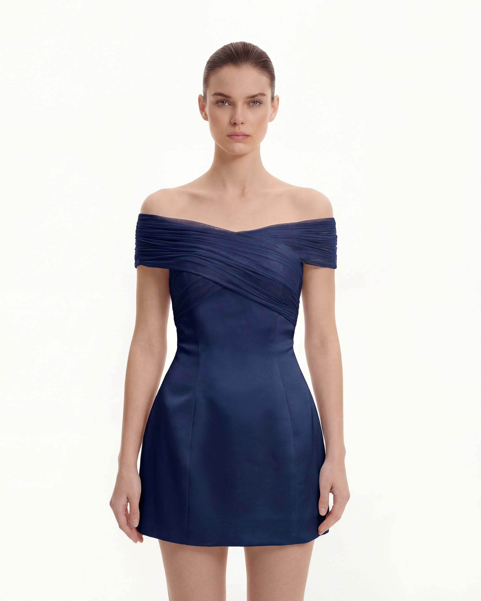 튤 크로스 홀터 새틴 미니 드레스 - 네이비 블루