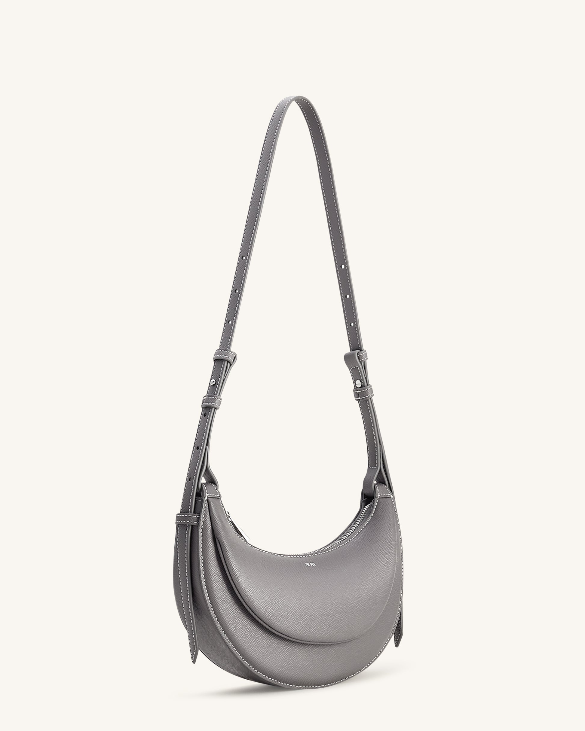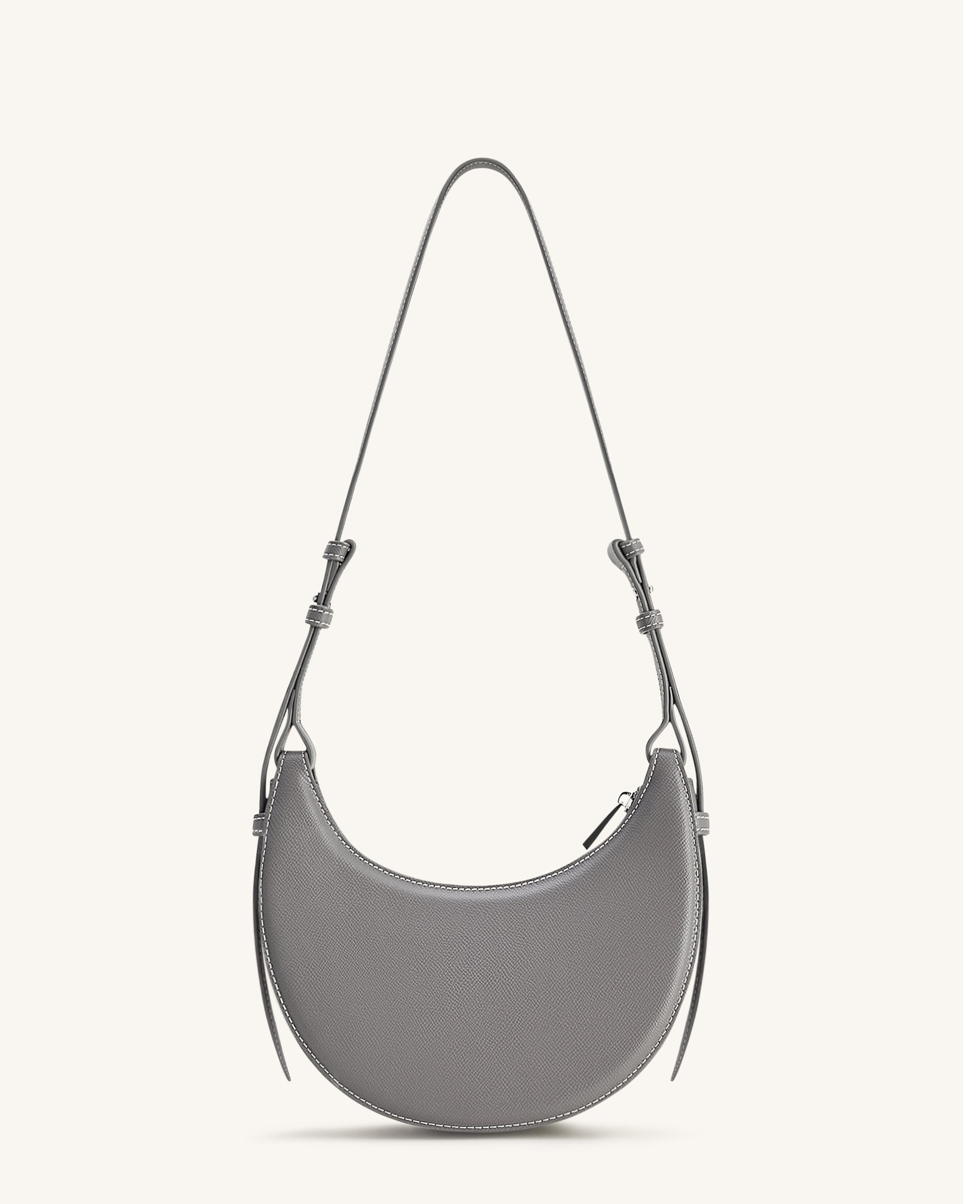 이 숄더백은 텍스처드 비건 가죽의 반달 실루엣이 특징입니다. 내부에 슬립 포켓이 있으며 실버 톤 하드웨어를 사용했습니다. 조절 가능한 스트랩으로 편안하게 숄더나 크로스바디로 착용할 수 있습니다.