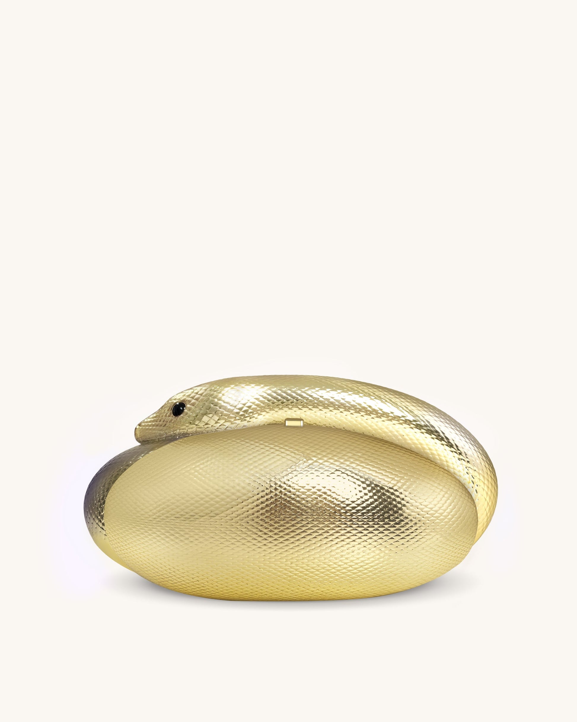 JW PEI의 이 조각 같은 클러치는 금색, 보라색, 은색의 무지갯빛 금속 색조로 감싸인 뱀 모양의 매혹적인 실루엣을 자랑합니다. 고광택 엠보싱 마감과 반짝이는 검은 눈으로 제작되어 예술 작품이자 강렬한 포인트 액세서리로도 손색없습니다. 이브닝 웨어나 아방가르드 패션 수집가들에게 대담한 선택입니다.