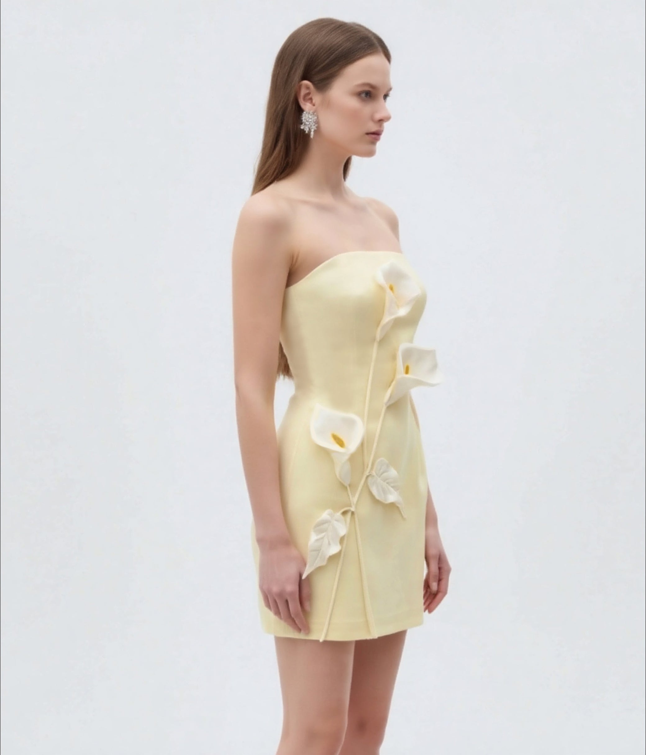 스트랩리스 플로럴 아플리케 드레스 - 옐로우