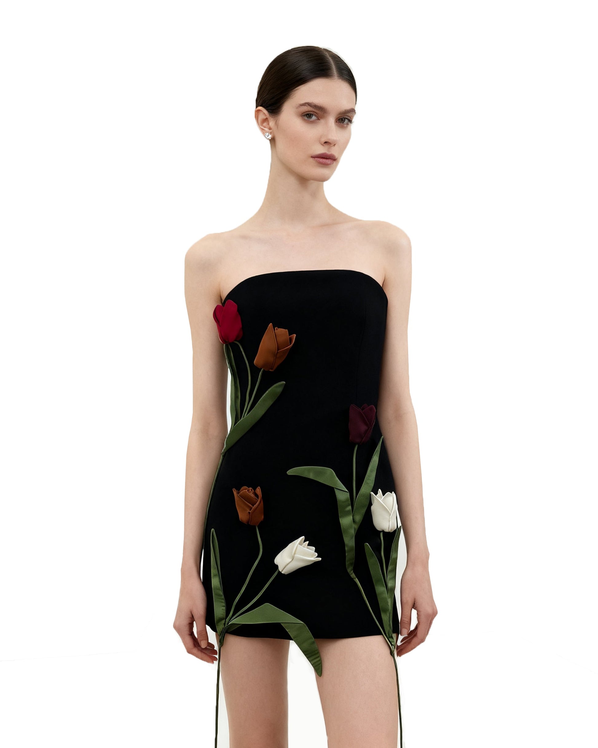 튤립 아플리케 스트랩리스 드레스 - 블랙
