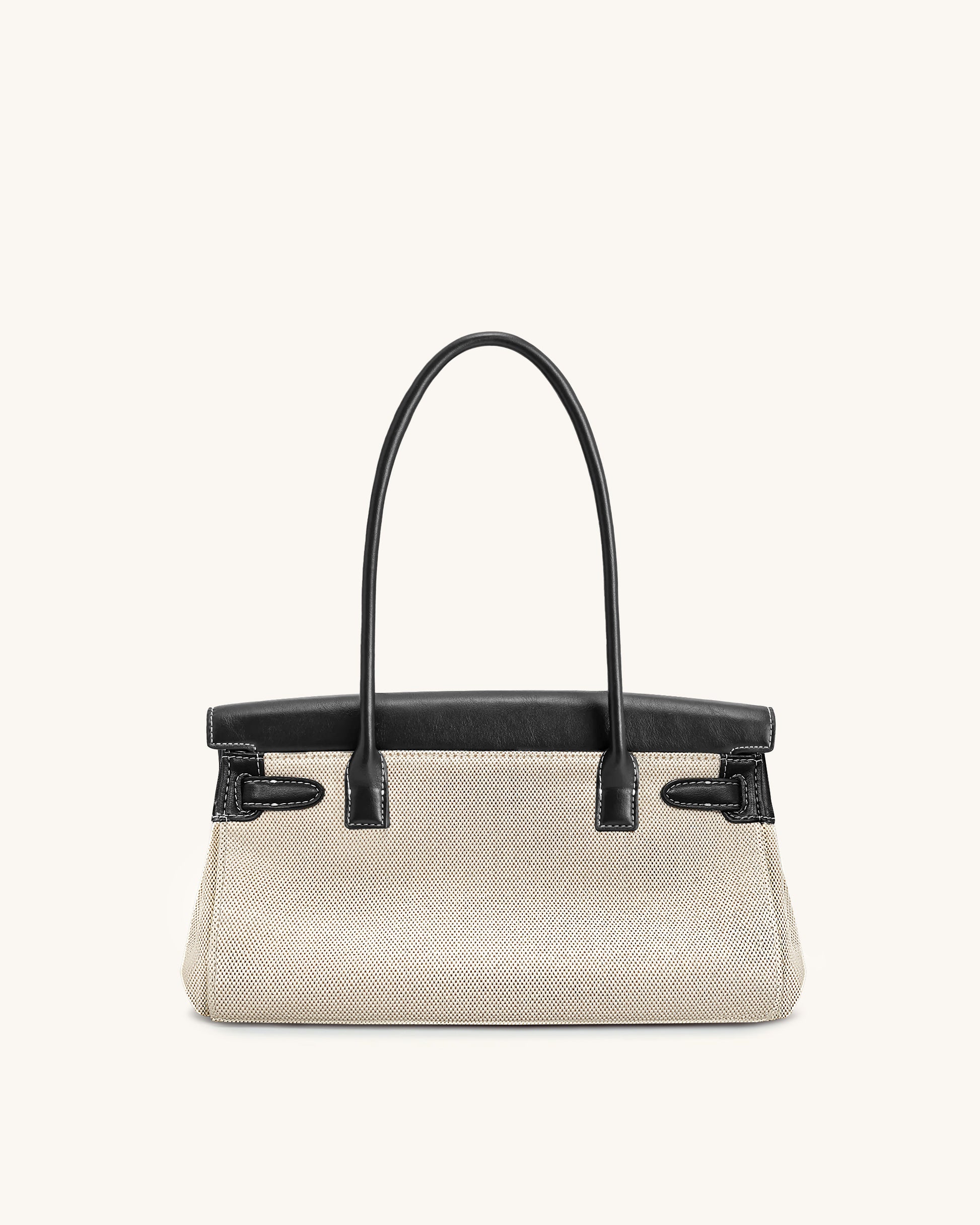 세련되고 구조적인 캔버스와 비건 레더 탑 핸들 백. 블랙과 베이지의 대비되는 컬러와 골드 하드웨어가 클래식한 스타일을 완성합니다. 일상 필수품을 넉넉하게 수납할 수 있으며, 트위스트 잠금장치로 안전하게 보관할 수 있습니다.