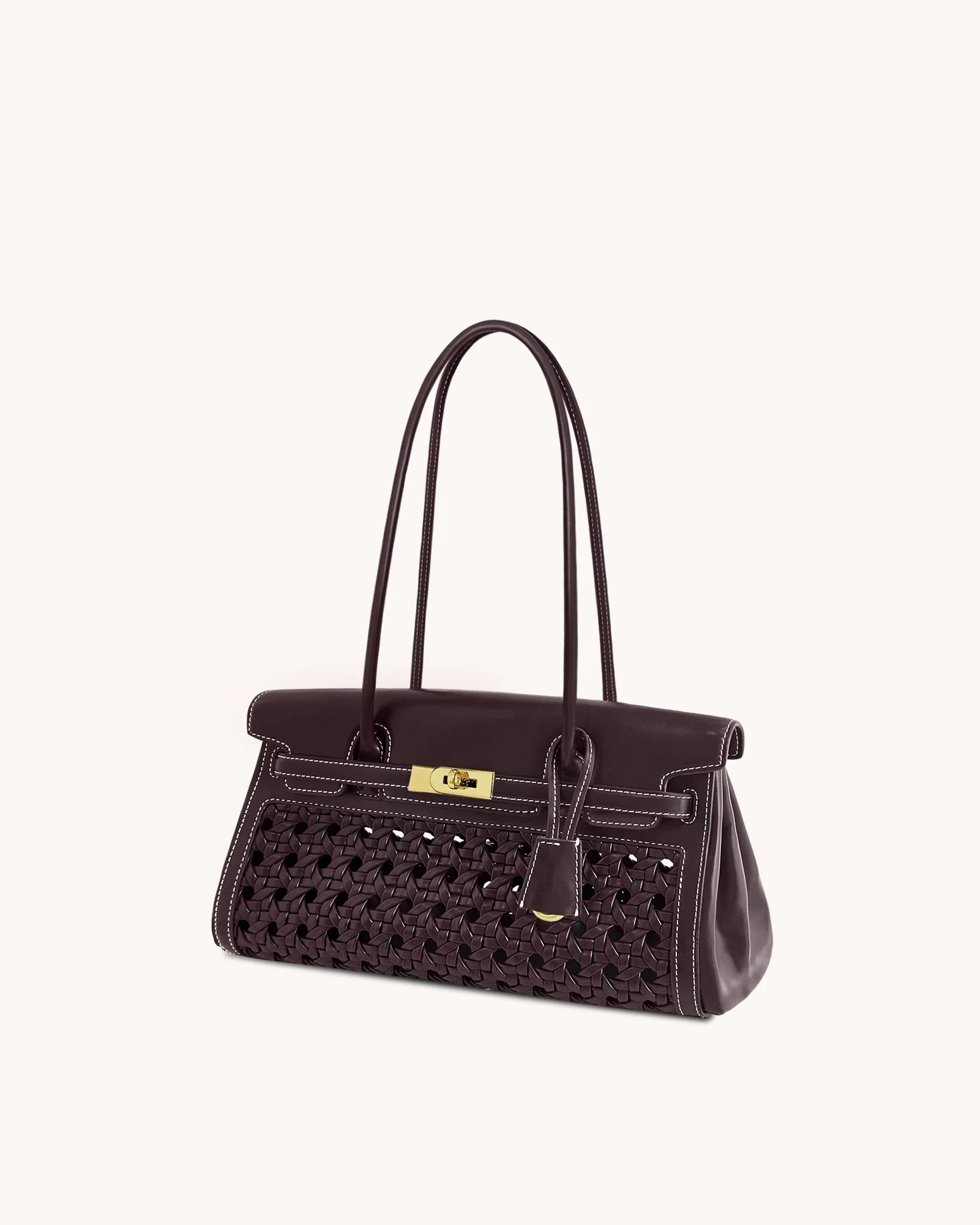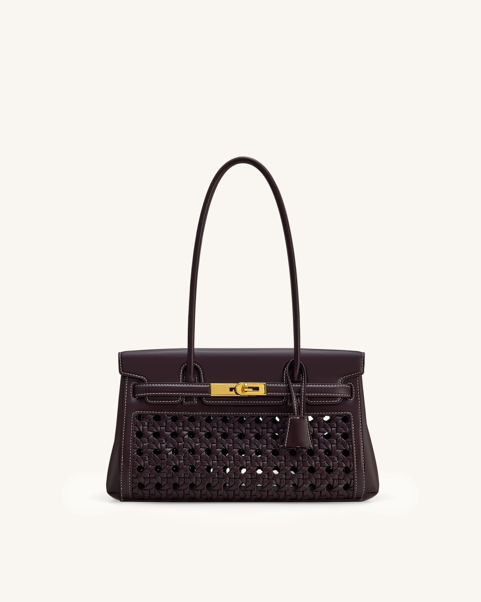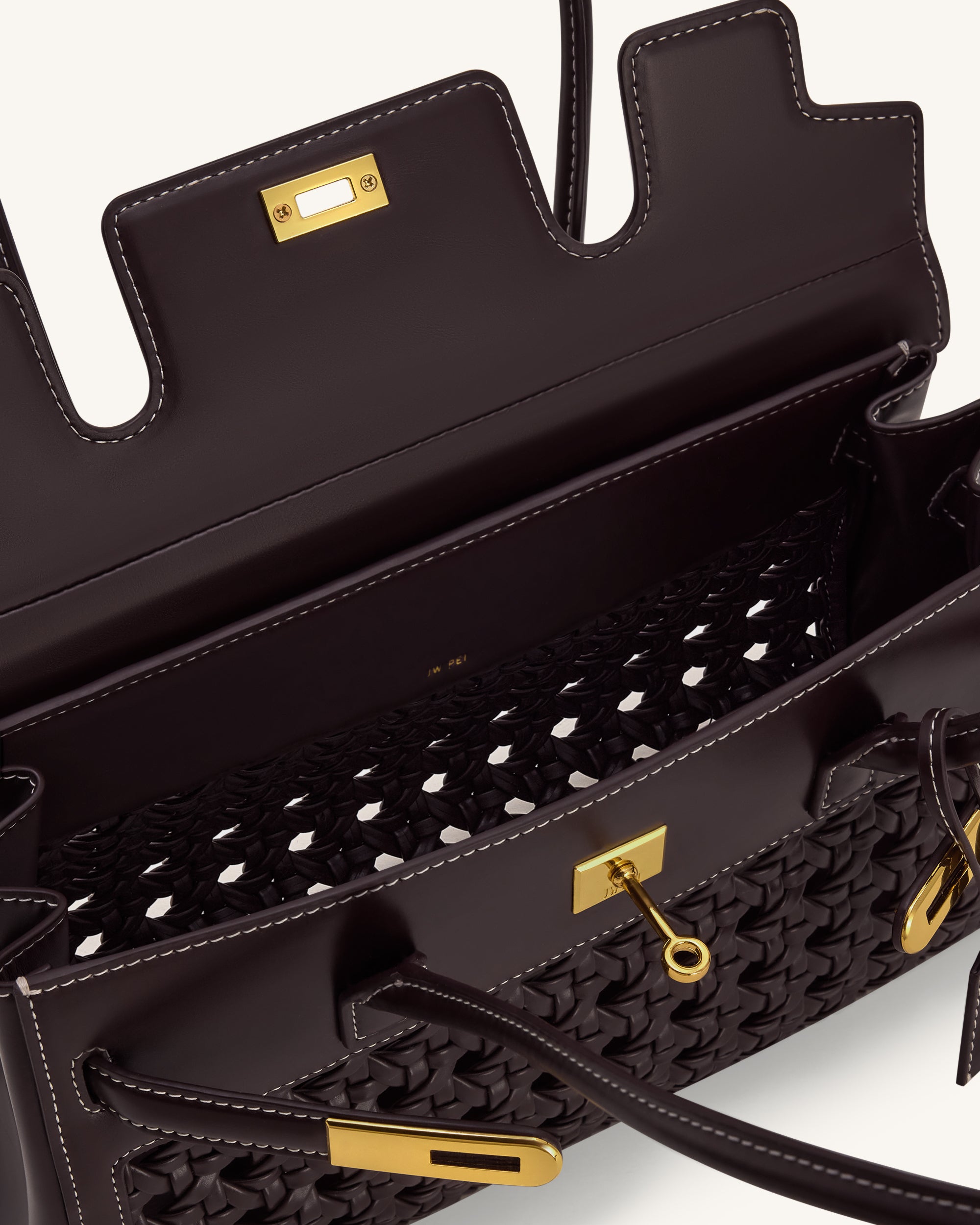앞면이 짜여진 우아한 탑 핸들 백과 골드 하드웨어. 넉넉하고 구조적이며 스타일리시해 일상 또는 사무실 사용에 적합합니다. 부드러운 질감과 세련된 외관으로 다용도이며 현대적인 느낌을 줍니다.