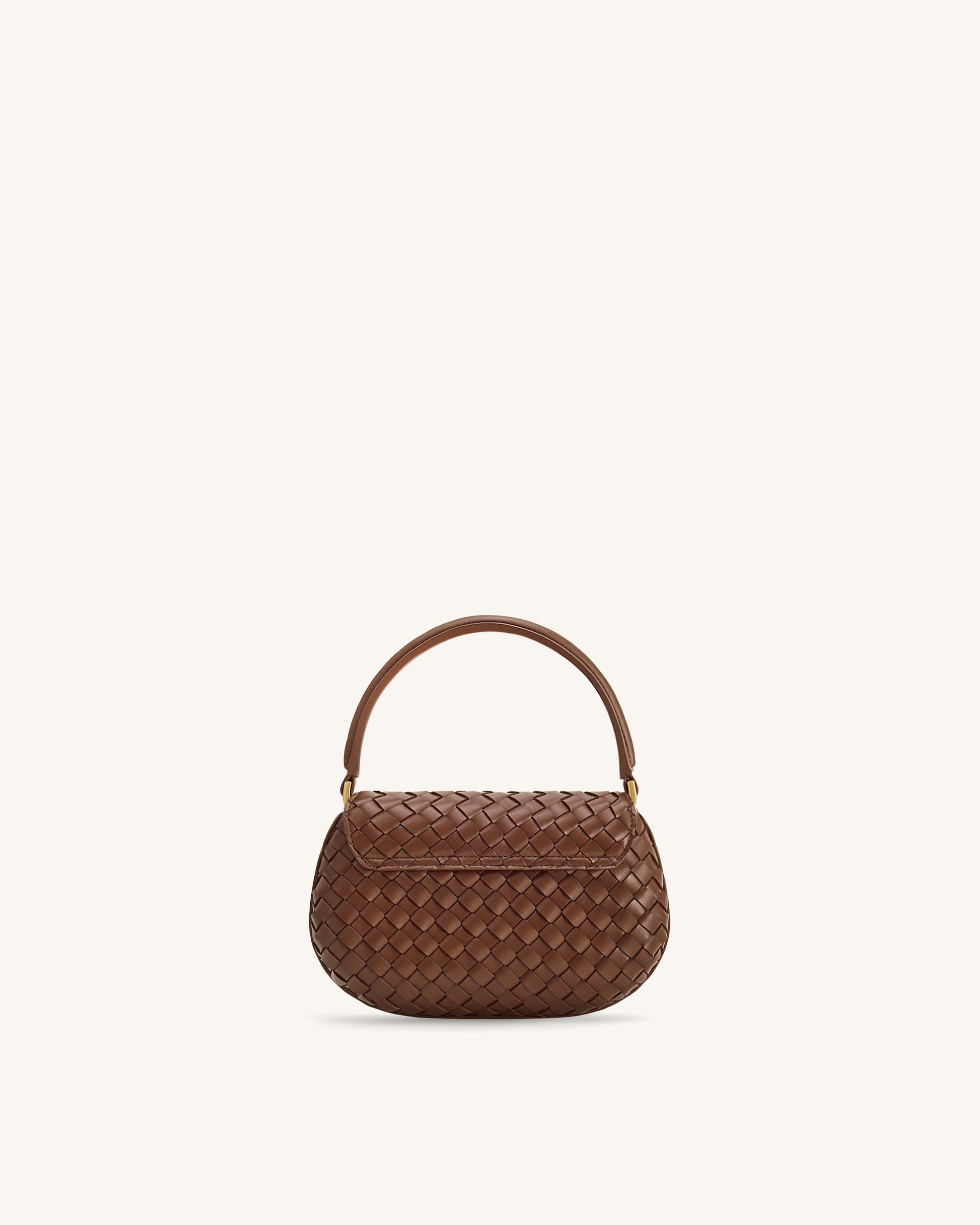 이 브라운 위븐 가죽 핸드백은 둥근 탑 핸들과 볼드한 사각 골드톤 클로저가 강조된 플랩 클로저를 갖춘 구조적인 실루엣을 자랑합니다. 시대를 초월한 디자인이 장인 텍스처와 현대적 우아함을 결합하여 일상 사용과 특별한 행사 모두에 적합합니다.